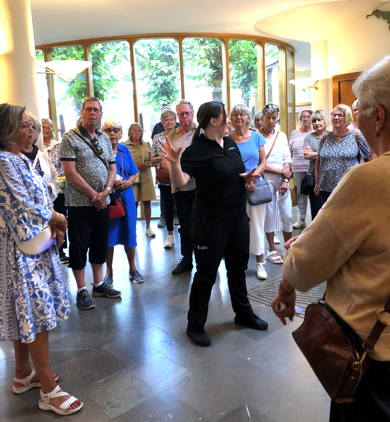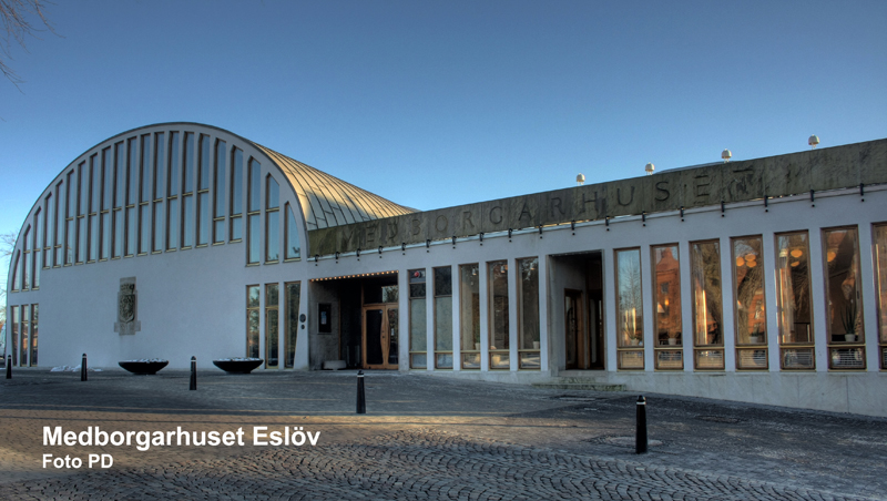 Vi var nästan 40 personer som äntrade bussen denna tisdagsmorgon för att ställa kosan mot Eslöv. Vår första anhalt var Medborgarhuset. I det semesterstängda huset öppnade man upp endast för oss. Uppdraget tilldelades den 26-årige arkitekten Hans Asplund, som också var engagerad i utbyggnaden av FN-skrapan i New York. Huset invigdes 1957 – designat in i minsta detalj. Särskilt imponerande var marmortrappan till bottenvåningen och den platsbyggda spiraltrappan. Vid senaste renoveringen 2003 återställdes huset i originalskick. Medborgarhuset är byggnadsminnesförklarat och har fått en hel del utmärkelser.