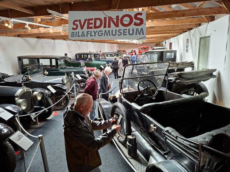 Väl framme på Svedinos bil- och luftfartsmuseum möttes vi av nylagat kaffe, bulle och kaka. Det var efterlängtat. Bland en otrolig samling av eleganta bilar från anno dazumal kunde vi på egen hand vandra runt. I en särskild hangar fanns alla flygplanen ända från Thulins experiment med dubbelvingade plan fram till bl.a. ”flygande Tunnan”.