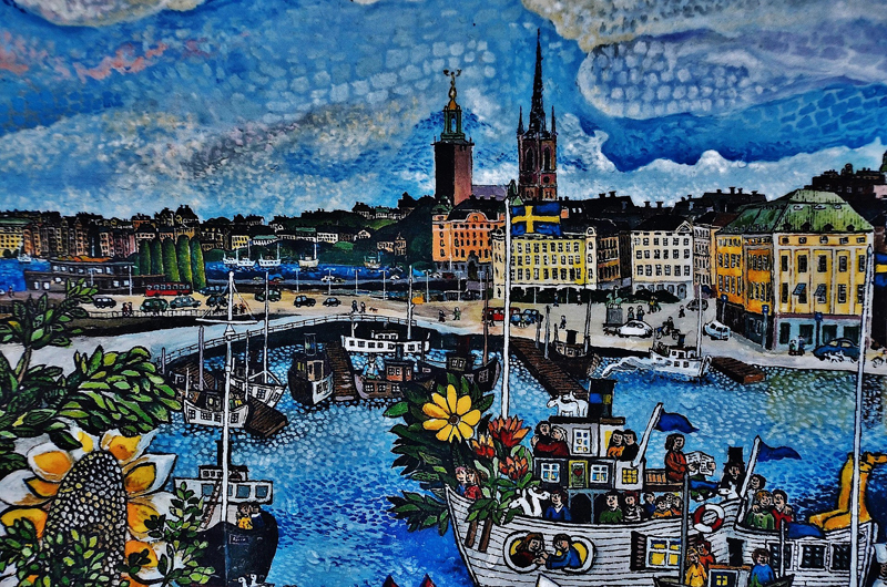 Det var på 1700-talet viktigt att försvara oss mot dansken och då låg Karlskrona med sin skärgård utmärkt till för att bygga upp en örlogsbas. Vi fick se ut över öarna från en höjd vid inloppet till staden. Så vackert! Bussen körde vidare till Brändaholm där röda stugor i en frodigt blomstrande miljö har vuxit fram, som i en saga.