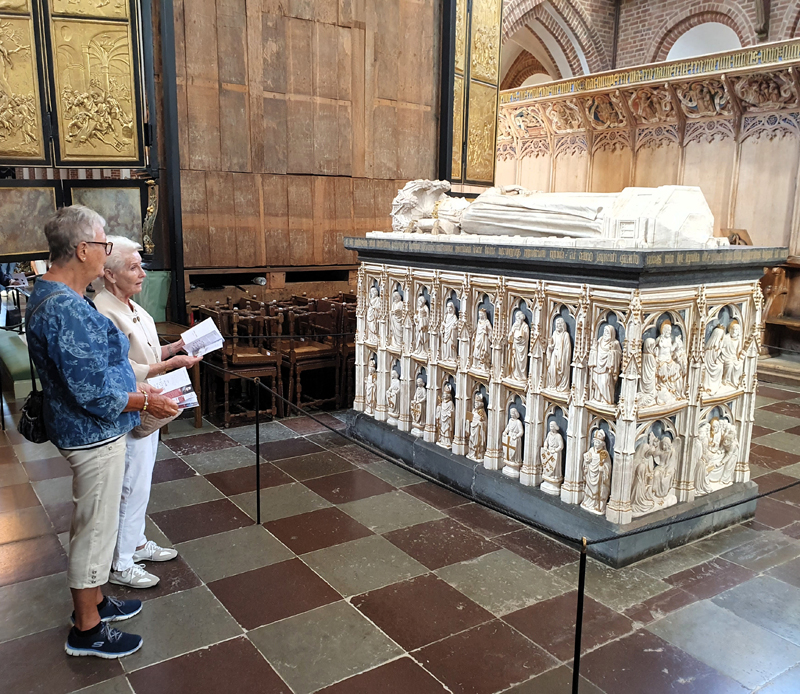 Vi kunde beundra Margrethe I:s ståtliga marmorsarkofag. Margrethe skapade Kalmarunionen 1389 och styrde därmed över ett rike som var större än både dåtidens Tyskland och Frankrike. Hennes önskan var att bli begravd i Sorö klosterkyrka vilket till en början också infriades. Så småningom såg biskopen till att hennes kvarlevor flyttades till Roskilde domkyrka.