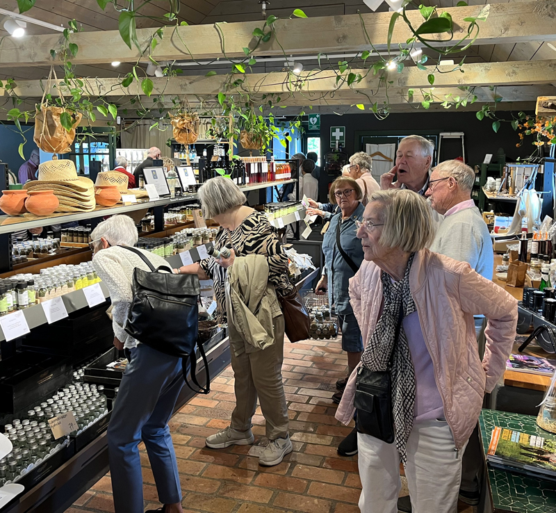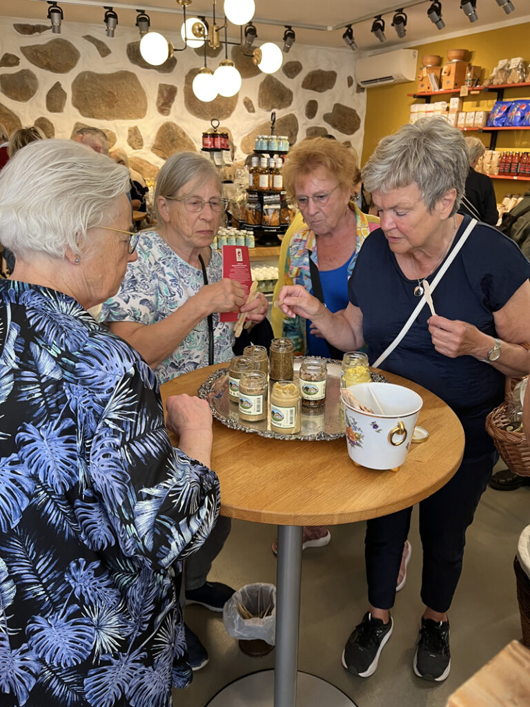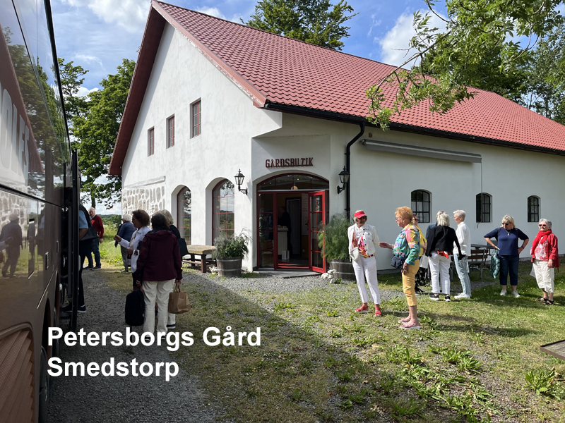 Nu närmar vi oss det sista stoppet på vår utflykt med ledorden ” Hans och Monica två pionjärer bakom förädlingen av det gyllenbruna fröet”. Vi är framme vid Petersborgs gård i Smedstorp där det odlas gula och bruna senapsfrö. På våren sår de senapen och skördar den på hösten. Efter skörd torkas och rensas senapsfröna därefter förädlas de till olika senapsprodukter efter egna recept. Här erbjuds bl a äkta Skånsk senap utan tillsatser.  Innan vi åter sätter oss i bussen för hemfärd är det många som passar på att handla olika senapssorter i gårdsbutiken.