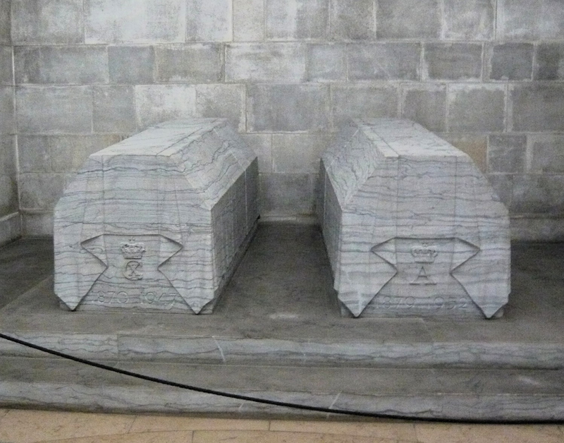 Av alla kungar och deras gemåler lade vi också märke till Christian X:s enkla kista som tillsammans med hustrun Alexandrines kista står bredvid varandra. Christian X satt på tronen under den tyska ockupationen under andra världskriget. Han blev en samlande symbol för det danska folket när han varje dag red genom Köpenhamn utan livvakter för att demonstrera sitt motstånd mot ockupationen. Han godtog inte att man hängde ut nazistiska flaggor och meddelade att de skulle tas bort. Den som vågar det blir skjuten direkt meddelade tyskarna. Då gör jag det själv sa kungen och honom vågade ingen ge sig på.