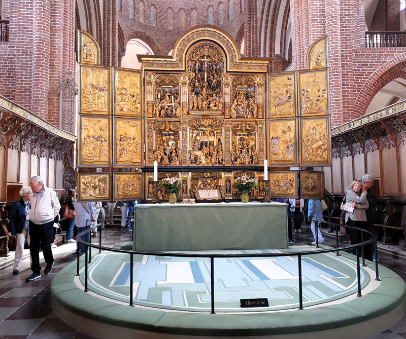 Varma vindar blåste när vi med full buss åkte över Öresundsbron till Roskilde Domkyrka. Vi började med fika vid bussen och kunde gå in i katedralen precis när de öppnade. Katedralen är Nordens största tegelkyrka och världsarv. Liksom andra stora byggnader är kyrkan byggd i etapper, varav de äldsta delarna har ursprung från 1100-talet. Idag mest känd som de danska kungligheternas gravkyrka.