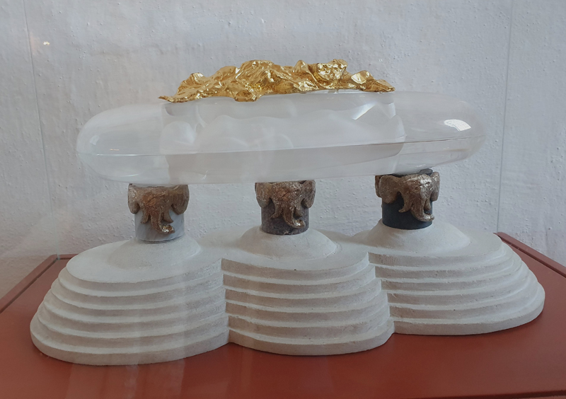 Vi ska inte heller glömma Margrethe II:s modell för hennes egen grav. Ritad av henne själv utförd i glas och vilar på 3 pelare föreställande elefanter gjorda av dansk granit. färöisk basalt och grönländsk marmor.