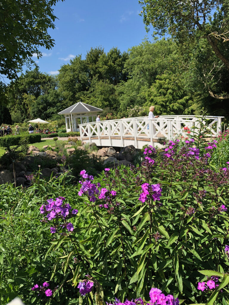 Lite mat var inte fel när vi kom fram till Birkegården, där en riklig buffé dukats upp. Mätta och belåtna kunde vi efter eget behag ta itu med trädgårdarna.Grundaren av trädgården försåg oss med en introduktion och karta. I klostergården kände vi på alla väldoftande örter. I engelska trädgården blommade rosorna jämte andra sommarblomster. De japanska trädgårdarna, som är Danmarks största, imponerade med stillhet, vattenspeglar och fascinerande formklippta gröna växter. I den stora dammen kunde barnen mata guldfiskarna. För barnens trevnad fanns klapp-vänliga smådjur på danska s.k. keledjur. Eftermiddagskaffe med äppelkaka avslutade besöket i Birkegårdens haver.