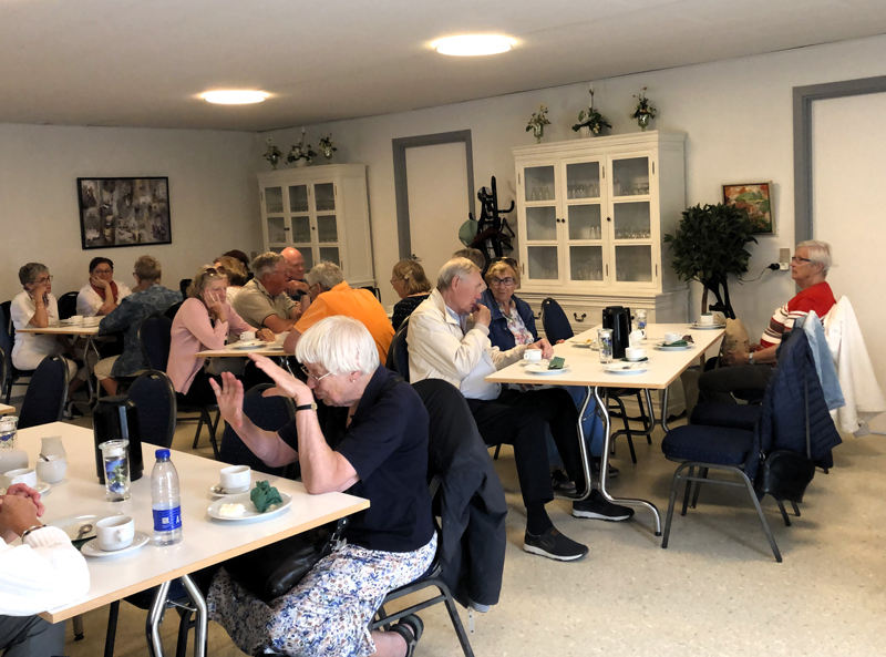 Nu började det kurra i våra magar och lite mat vore inte fel. Vi åkte på smala vägar till Björks Fisk vid Ringsjön och där serverades varmrökt lax med dillsås och potatis som smakade väldigt gott. För de som önskade fanns tillfälle till inköp av delikatesser.